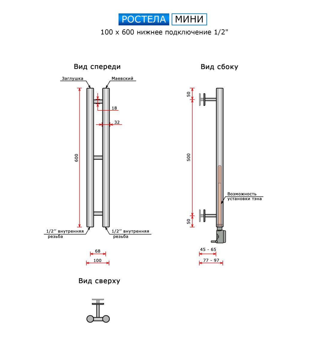 Полотенцесушитель Ростела Мини нижн.подв.1/2" черный 100 х 600 / 2