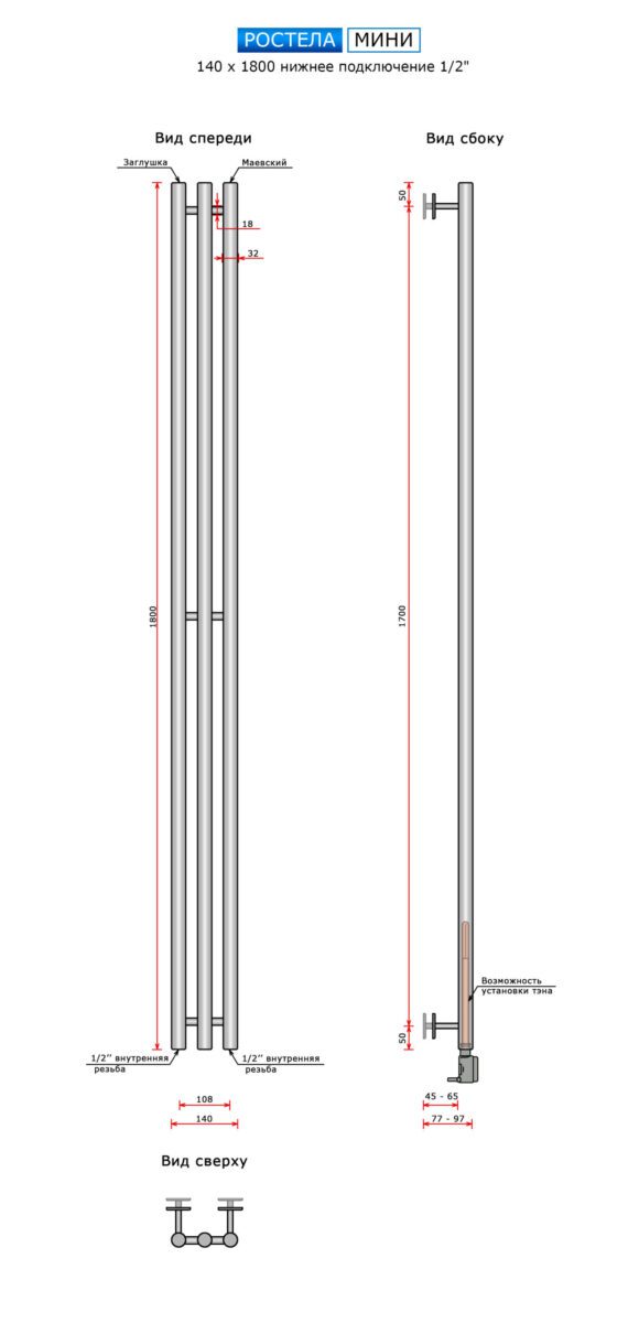 Полотенцесушитель Ростела Мини нижн.подв.1/2" черный 140 х 1800 / 3
