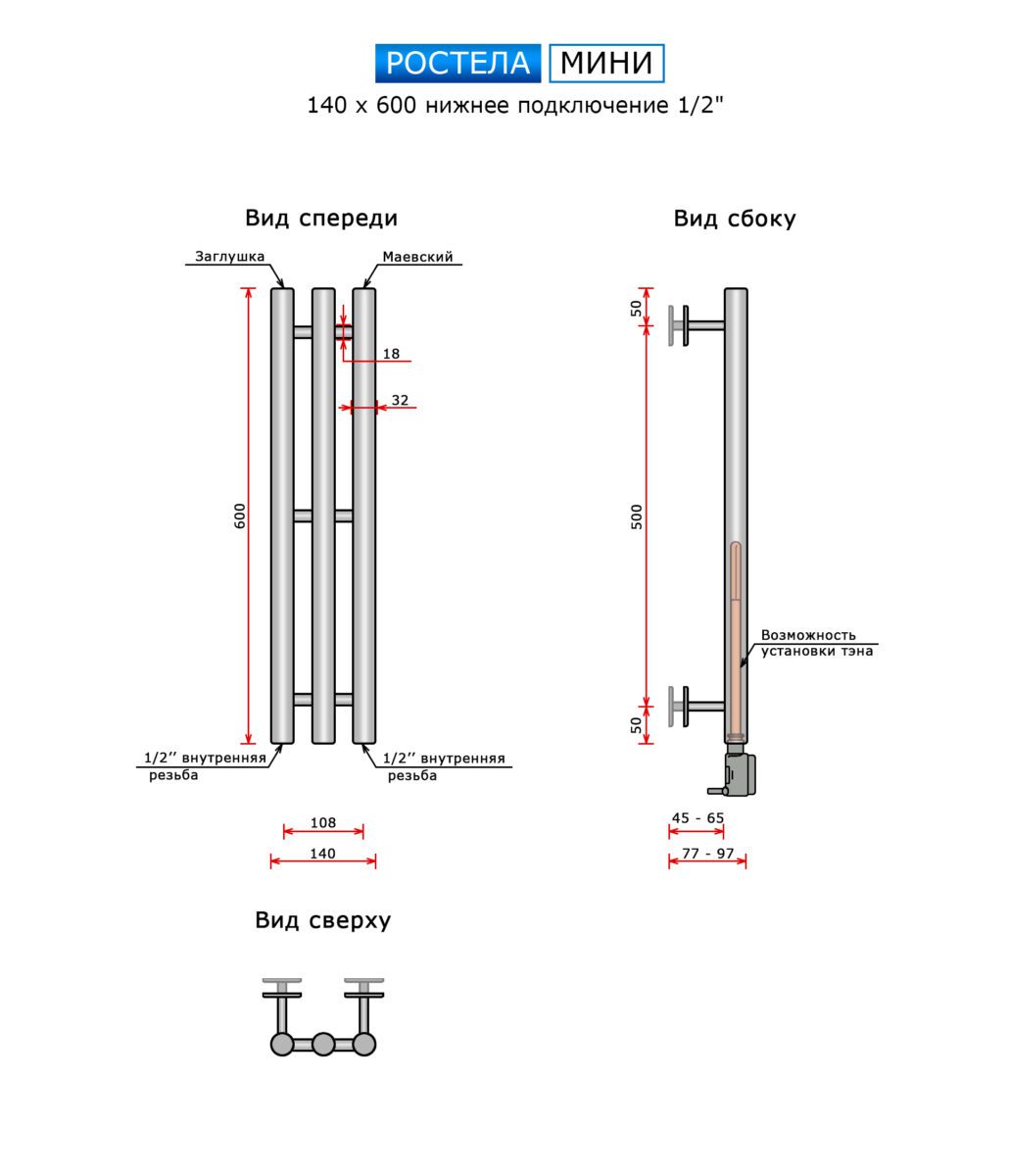 Полотенцесушитель Ростела Мини нижн.подв.1/2" черный 140 х 600 / 3