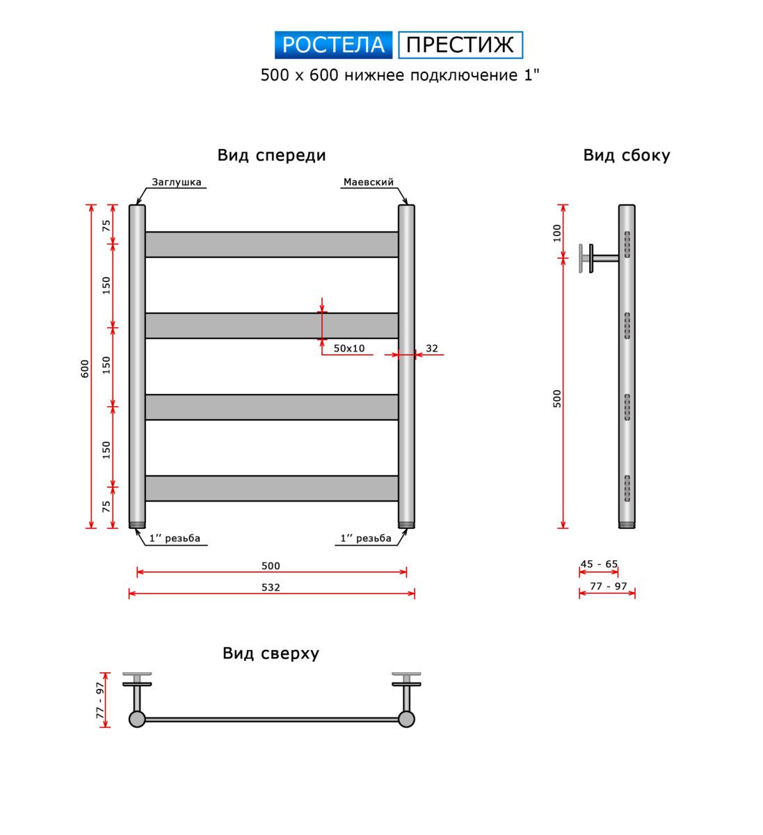 Полотенцесушитель Ростела Престиж нижн.подв.1" 500х600/4