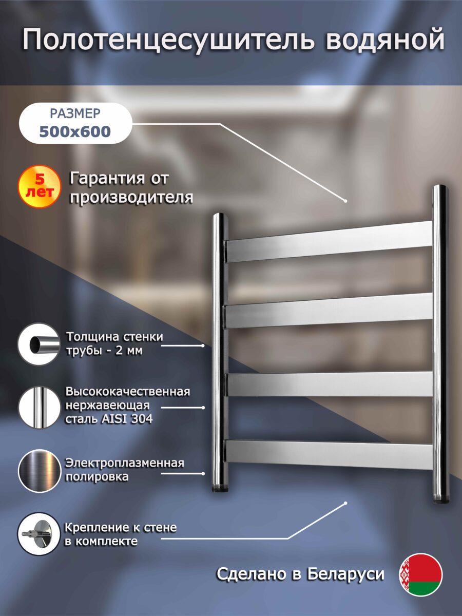 Полотенцесушитель представляет собой лесенку с прямоугольными перекладинами 10х50 мм, расположенными равноудаленно. Отличный вариант для тех, кому необходим профильный полотенцесушитель с наружной резьбой с диаметром подключения 1″.