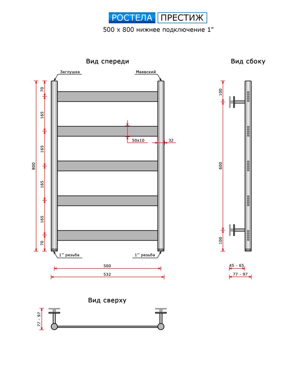 Полотенцесушитель Ростела Престиж нижн.подв.1" 500х800/5