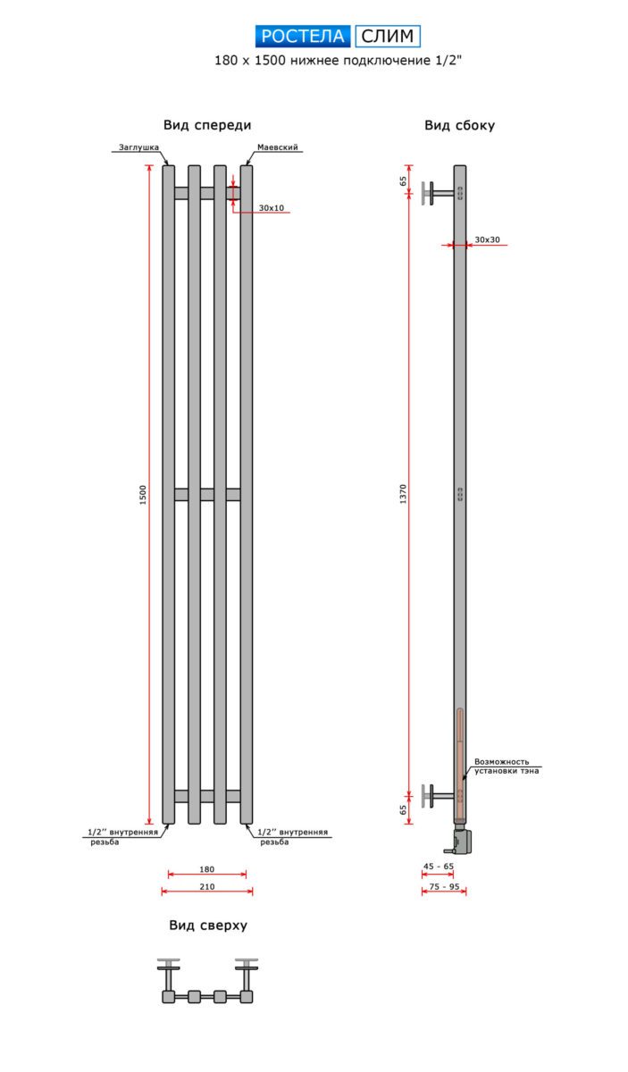 Полотенцесушитель Ростела Слим белый нижн.подв.1/2" 180х1500/4