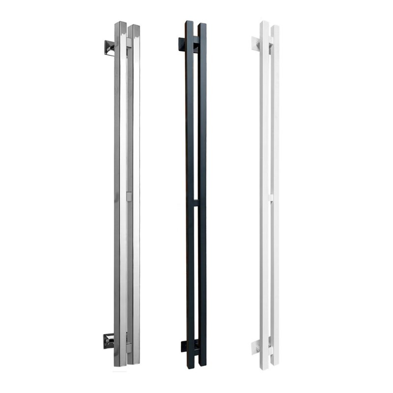 Полотенцесушитель подходит в самые современные и модные дизайн-концепции. За счет вертикального размещения одной стойки квадратного профиля эта модель является негабаритной и лаконичной. Дополнительно для удобства можно приобрести вешалки-крючки.