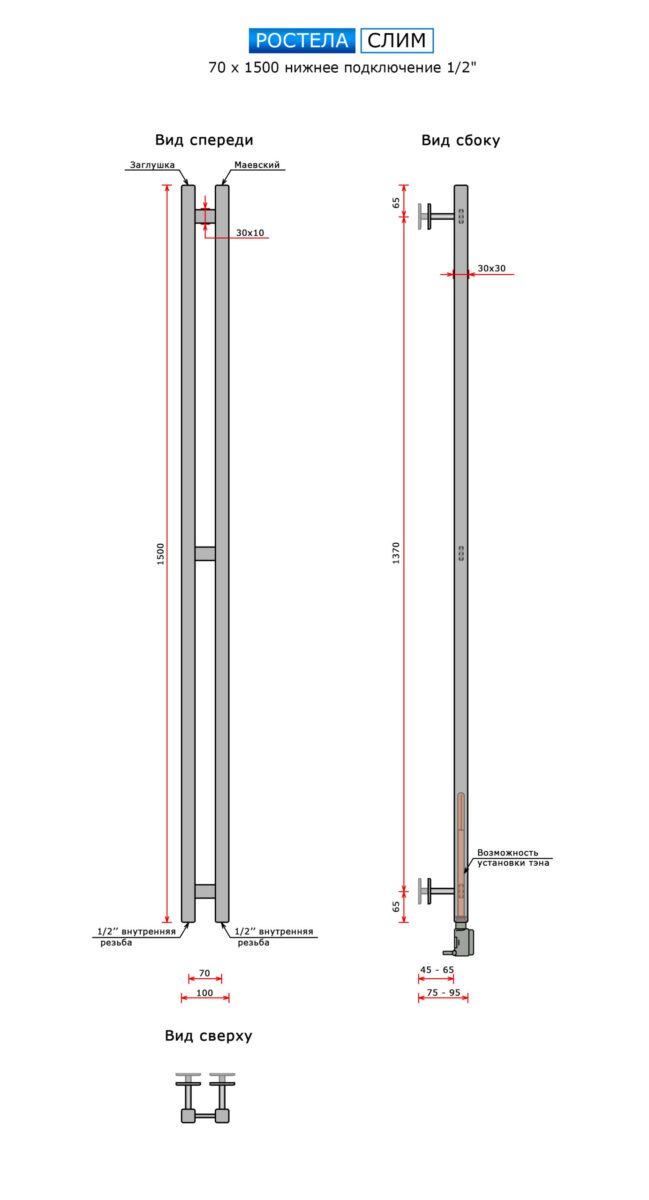 Полотенцесушитель Ростела Слим белый нижн.подв.1/2" 70х1500/2