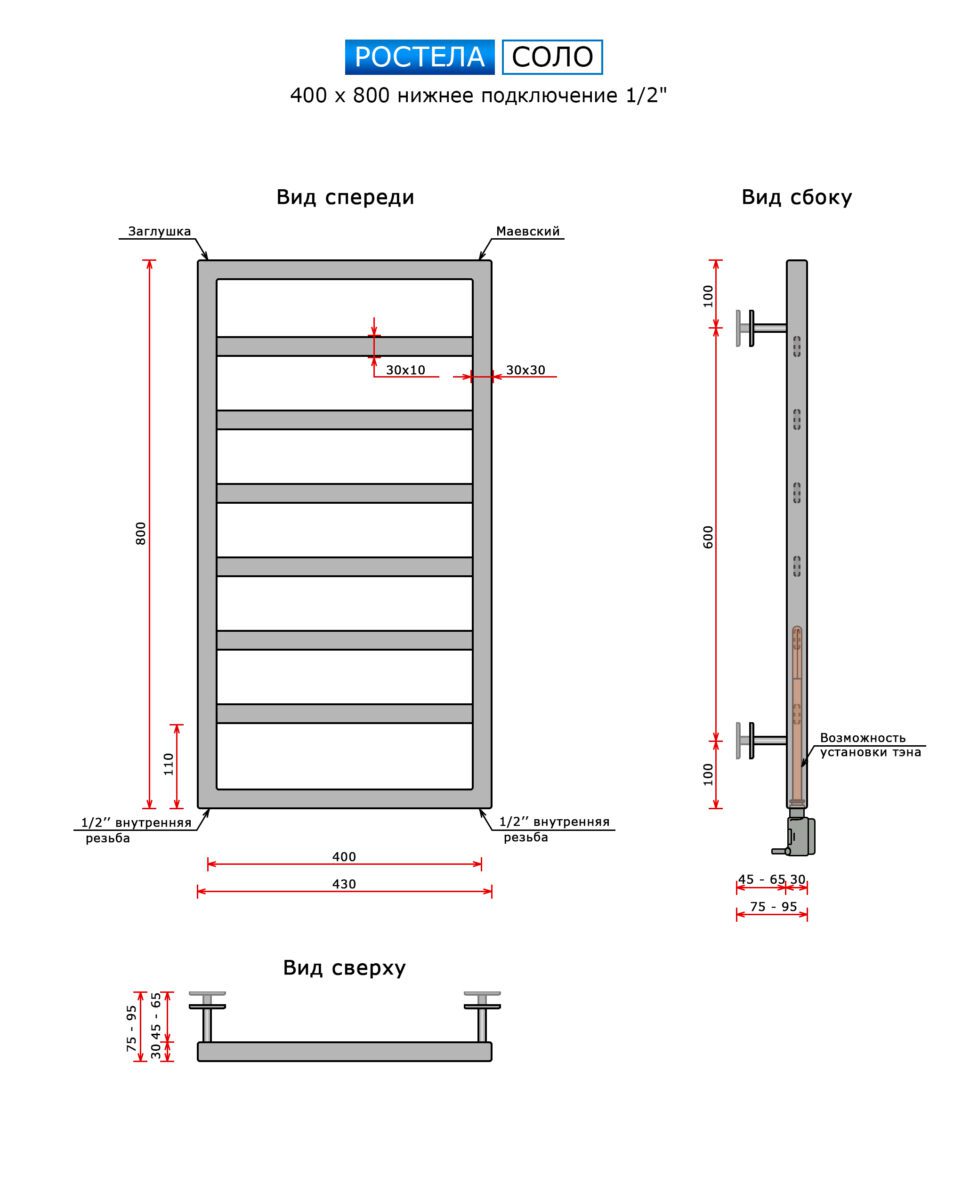 Полотенцесушитель Ростела Соло ниж.подв. 1/2" 400х800/8