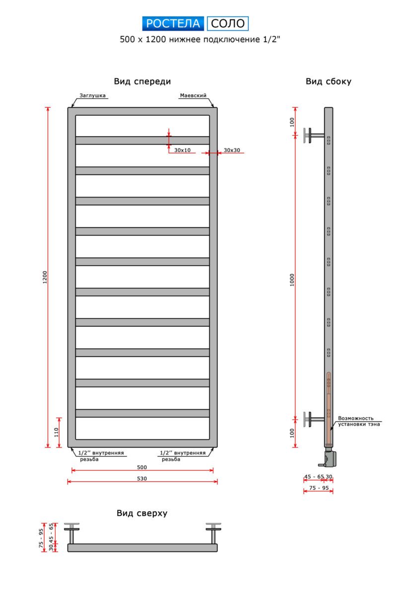 Полотенцесушитель Ростела Соло ниж.подв. 1/2" 500х1200/12