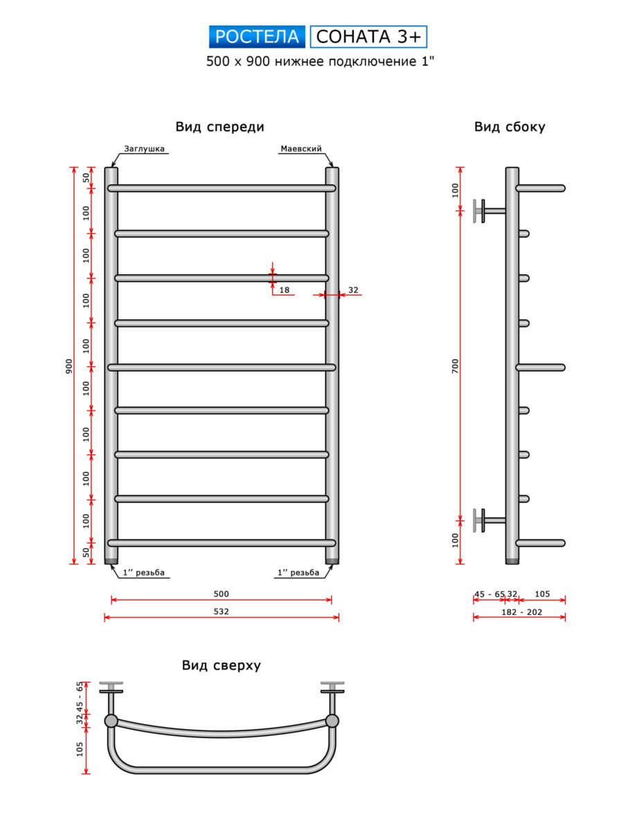 Полотенцесушитель Ростела Соната 3+ (3 полки нижн.подв., 1" резьба) 500 x 900 / 9