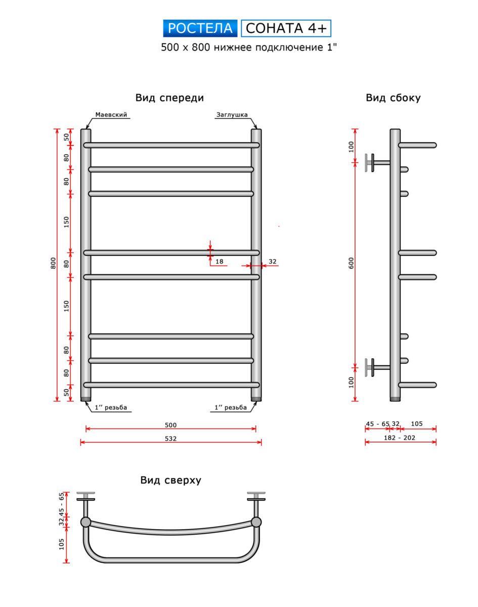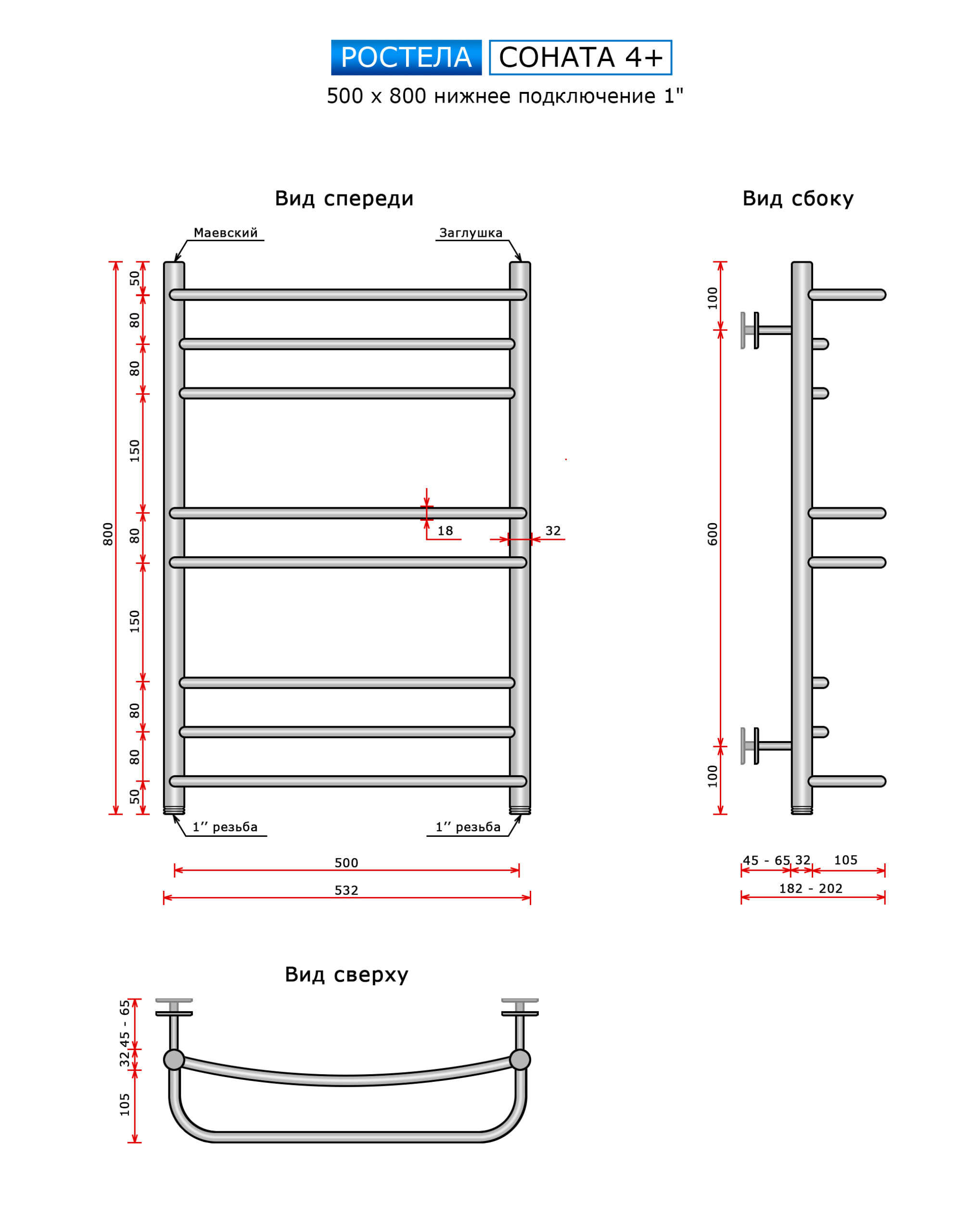 Полотенцесушитель Ростела Соната 4+ (нижн.подв.,1" рез) 500 x 800 / 8