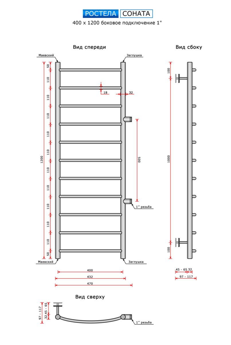 Полотенцесушитель Ростела Соната (бок.подв., 1" резьба) 400 х 1200 / 11