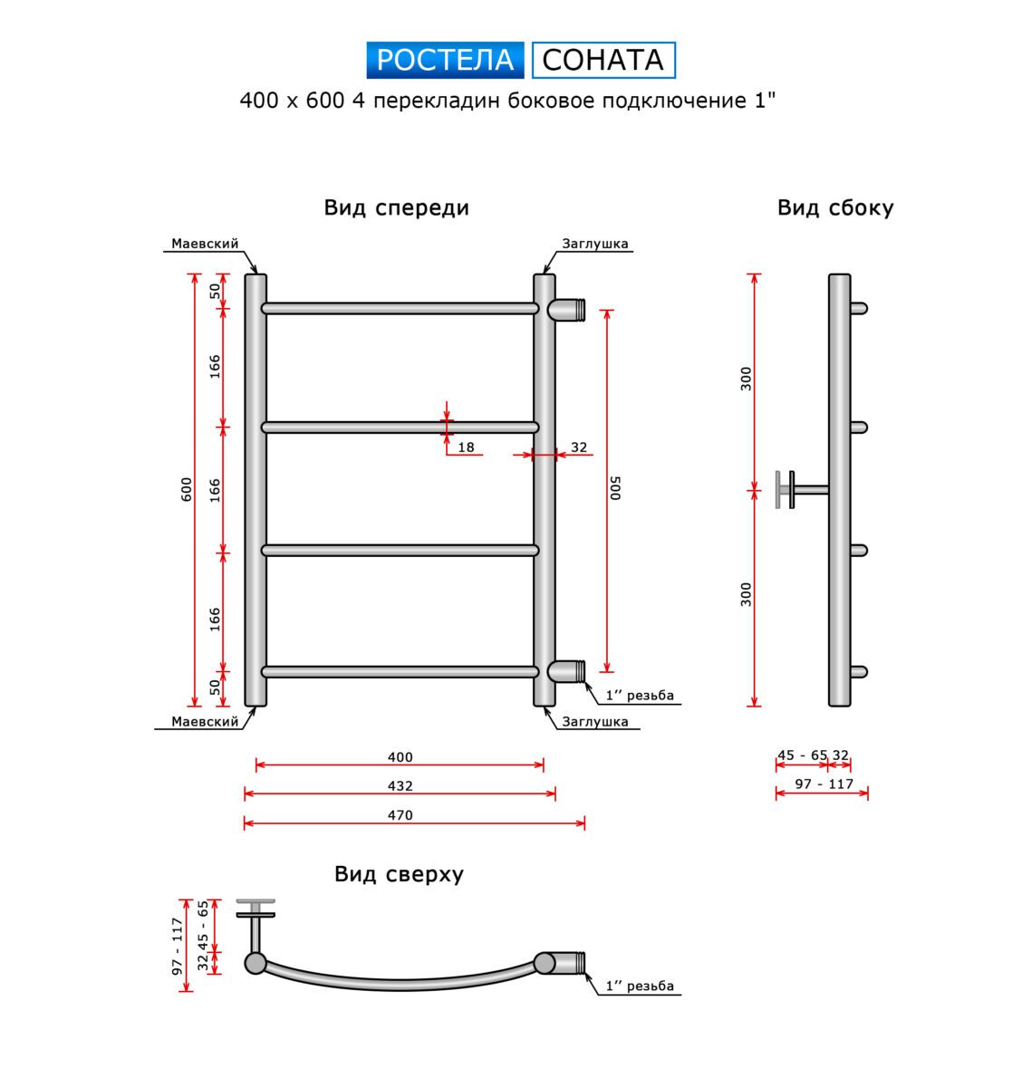 Полотенцесушитель Ростела Соната (бок.подв., 1" резьба) 400 х 600 / 4