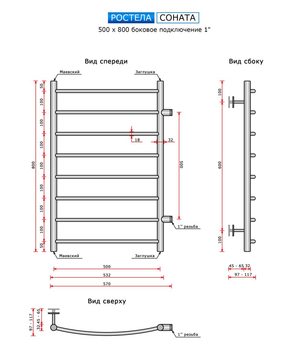 Полотенцесушитель Ростела Соната (бок.подв., 1" резьба) 500 х 800 / 8