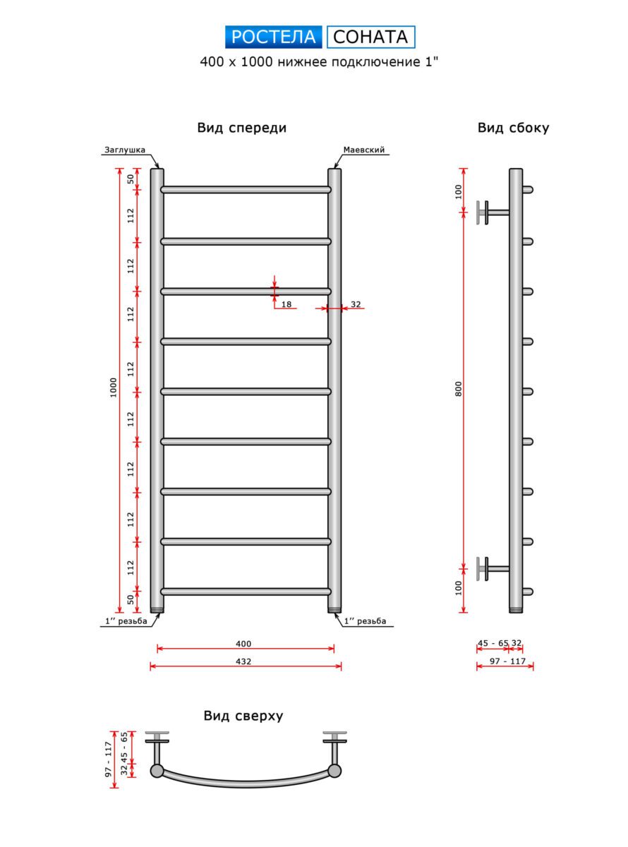Полотенцесушитель Ростела Соната (нижн.подв., 1" резьба) 400 х 1000 / 9