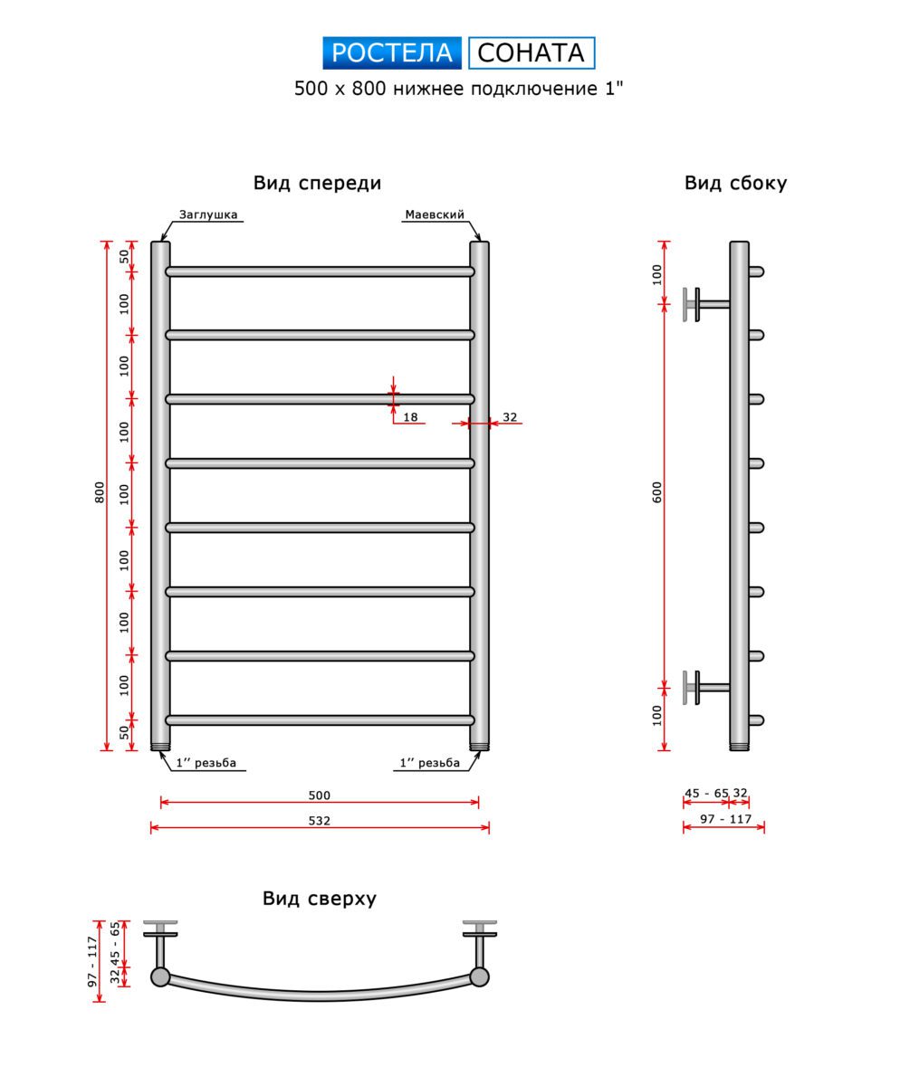 Полотенцесушитель Ростела Соната (нижн.подв., 1" резьба) 500 х 800 / 8