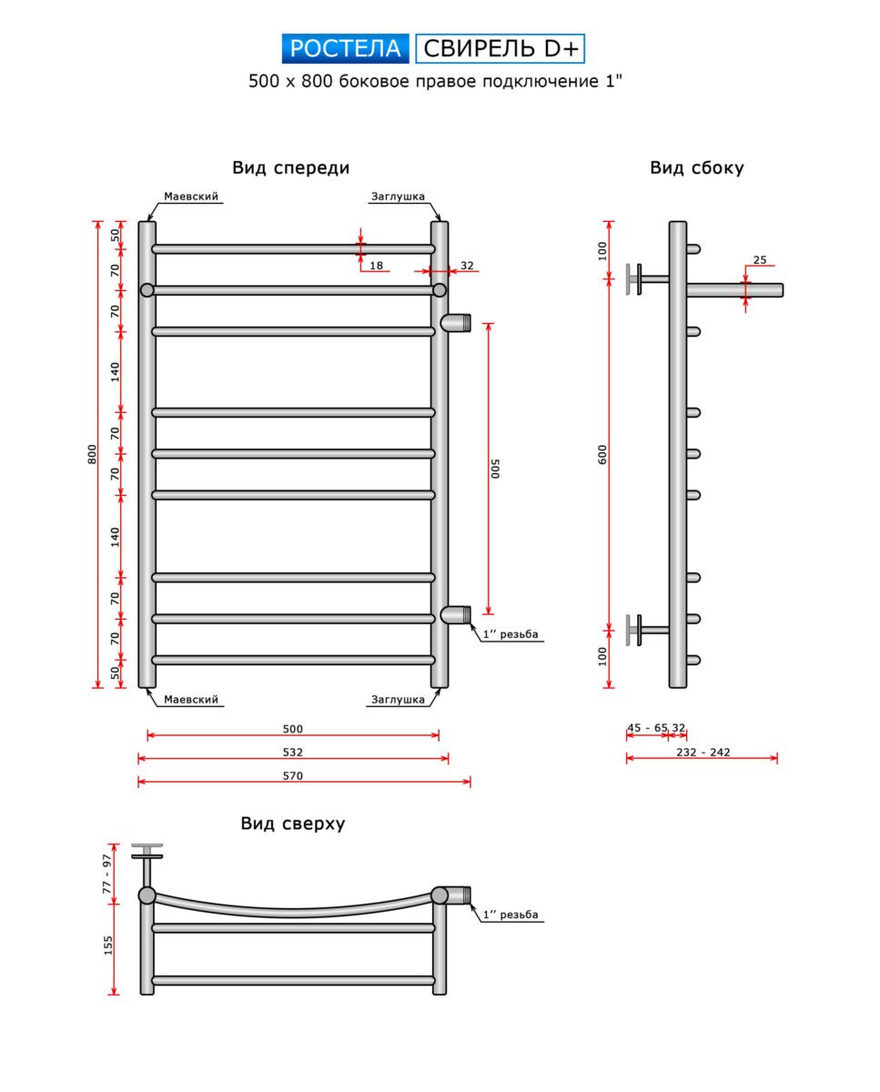 Полотенцесушитель Ростела Свирель D+ (бок.подв. правый,1"рез) 500*800/10