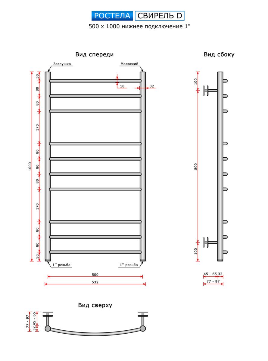 Полотенцесушитель Ростела Свирель D (нижн.подв.,1" рез) 500*1000/10