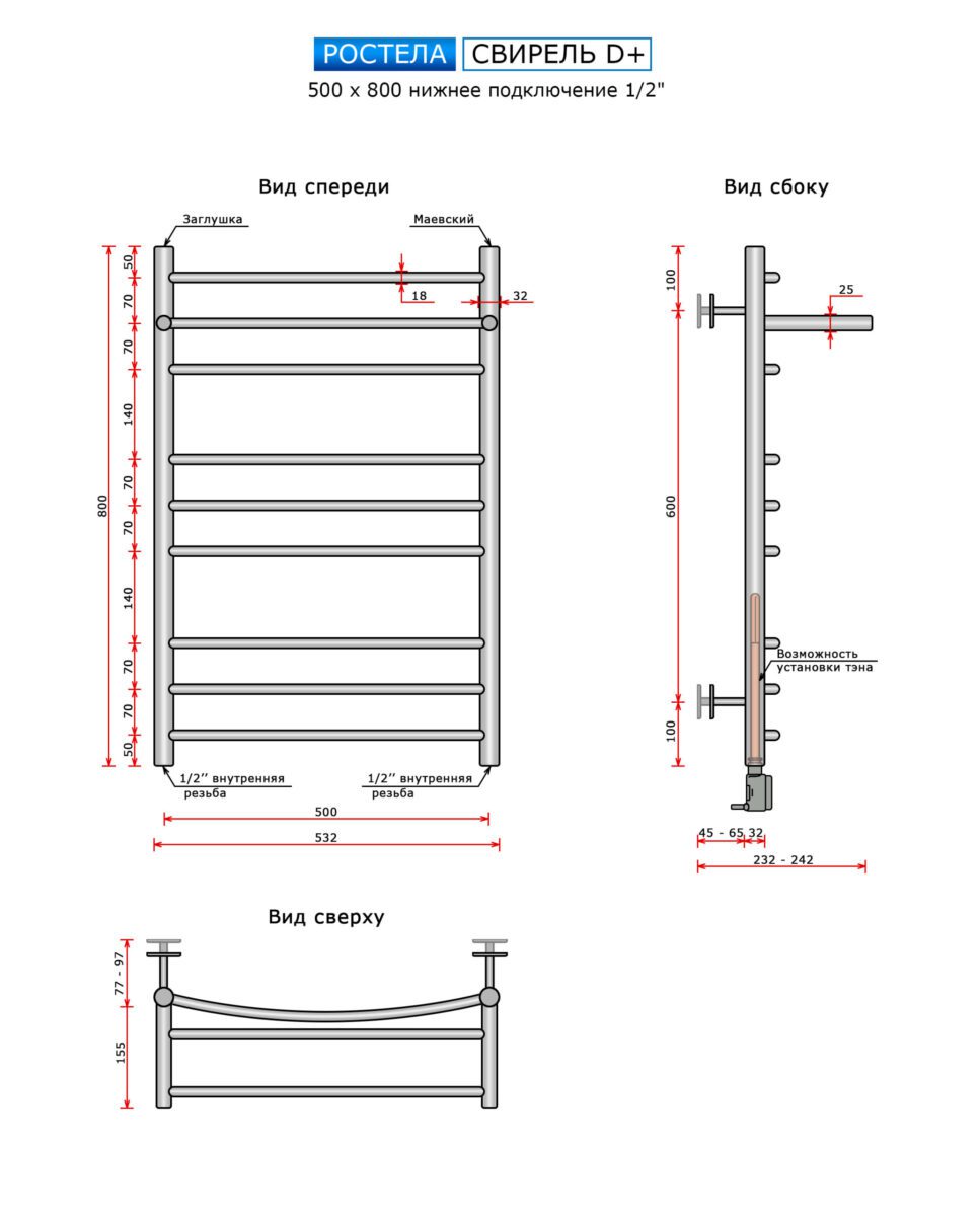 Полотенцесушитель Ростела Свирель D+ (с пол.,нижн.подв.,1/2" рез) 500*800/10