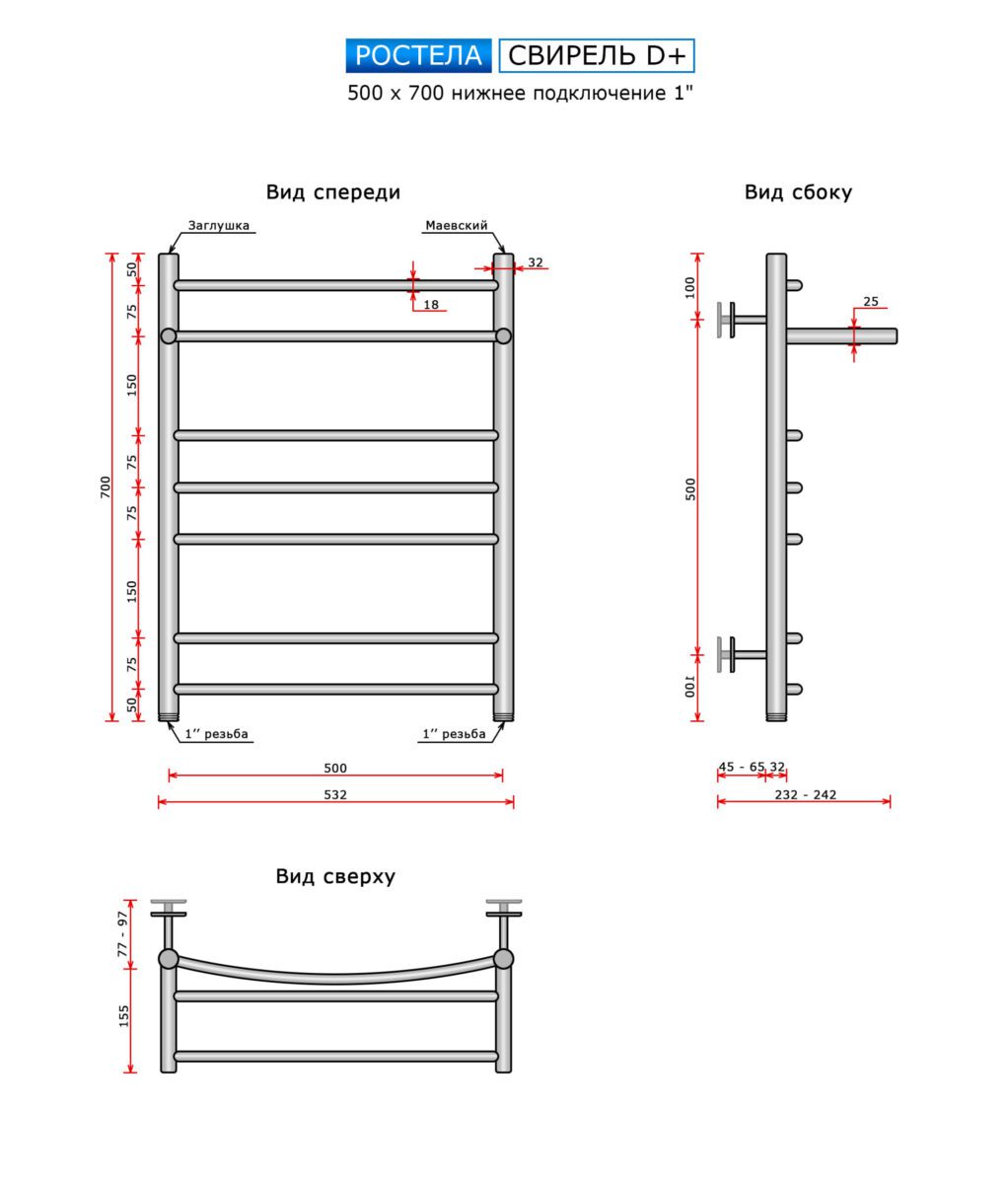 Полотенцесушитель Ростела Свирель D+ (с пол.,нижн.подв.,1" рез) 500*700/8