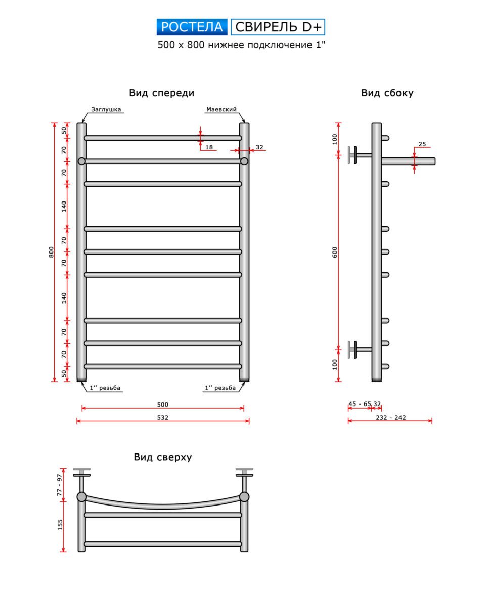 Полотенцесушитель Ростела Свирель D+ (с пол.,нижн.подв.,1" рез) 500*800/10