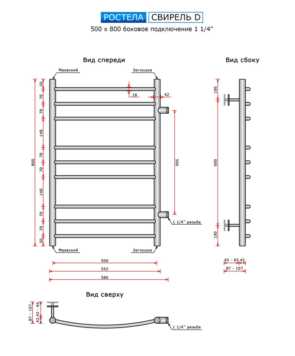 Полотенцесушитель Ростела Свирель Ду-32 D (бок.подв.,1 1/4"рез) 500*800/9