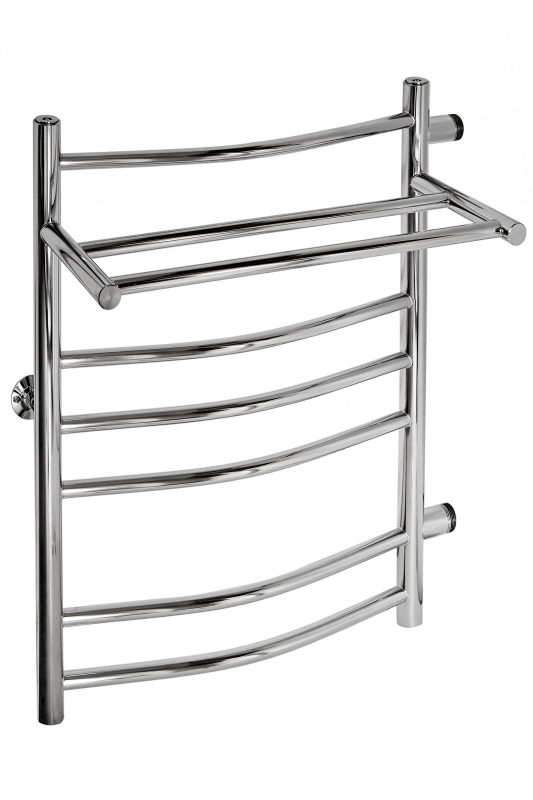 Полотенцесушитель представляет собой лесенку круглого профиля с верхней полкой и с боковым подключением 1.1/4″ (внешний диаметр 42 мм). Доведен до зеркального блеска технологией электроплазменной полировки. Перекладины дугообразные и расположены группами.