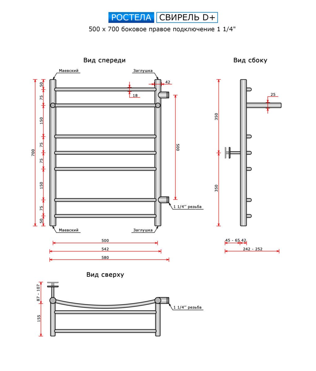 Полотенцесушитель Ростела Свирель Ду-32 D+ (бок.подв. правый,1 1/4" рез) 500*700/8