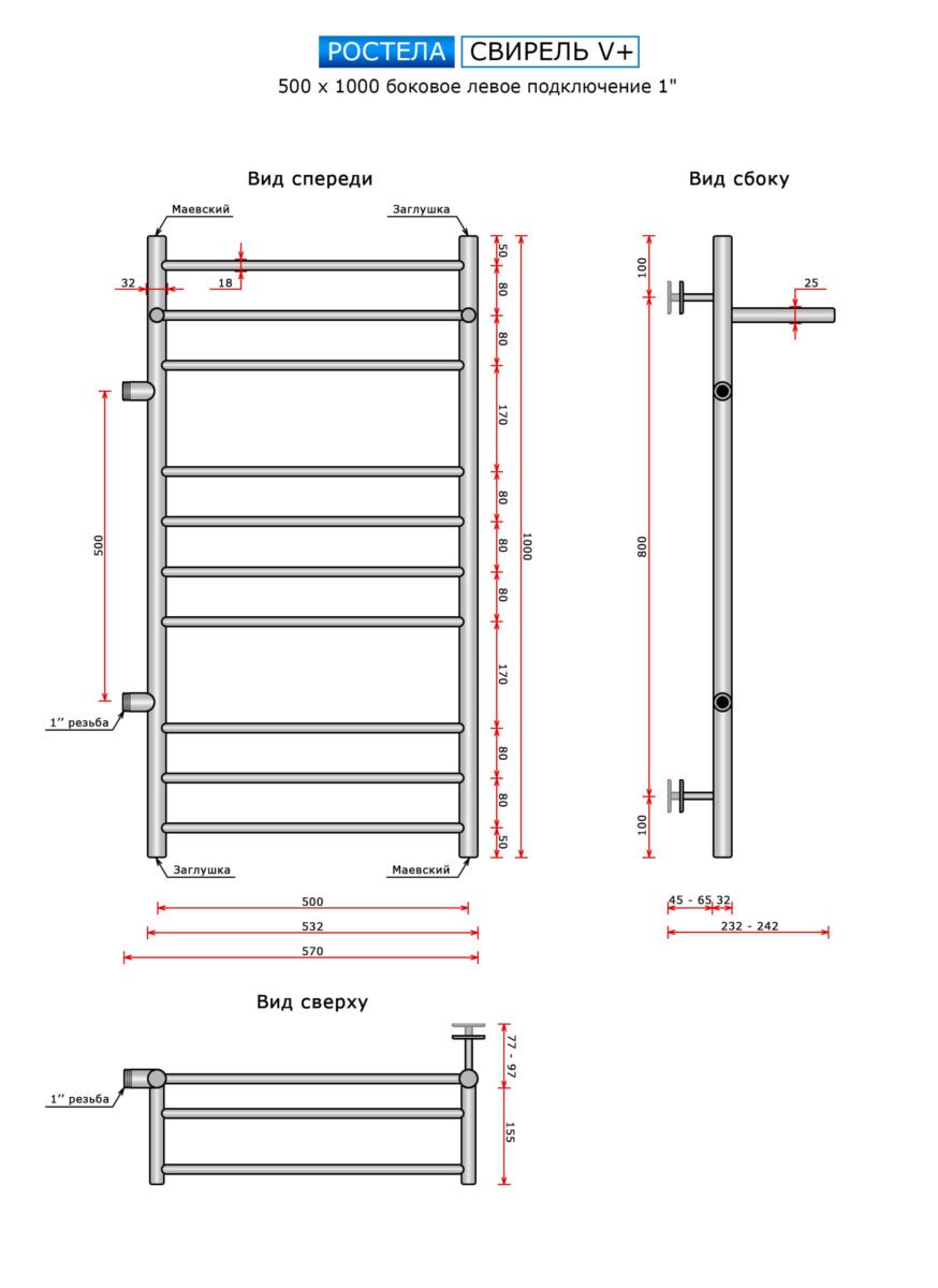 Полотенцесушитель Ростела Свирель V+ (бок.подв. левый,1"рез) 500*1000/11