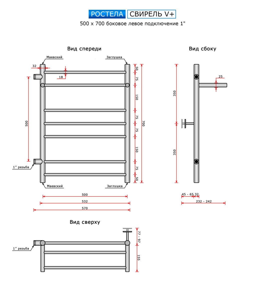 Полотенцесушитель Ростела Свирель V+ (бок.подв. левый,1"рез) 500*700/8