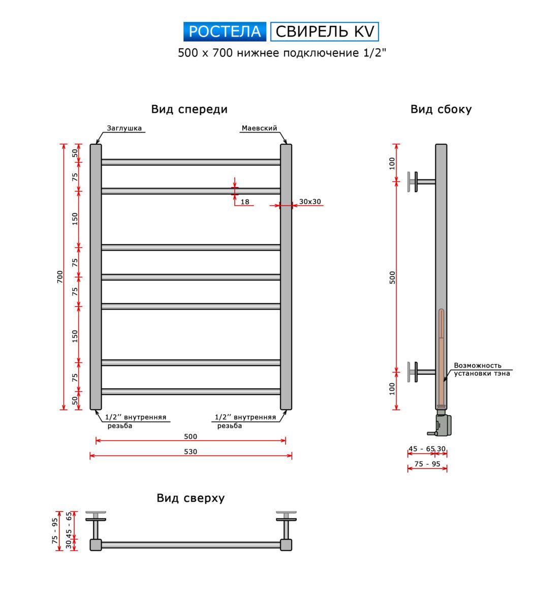 Полотенцесушитель Ростела Свирель V квадрат (нижн.подв.,1/2" рез) 500*700/7