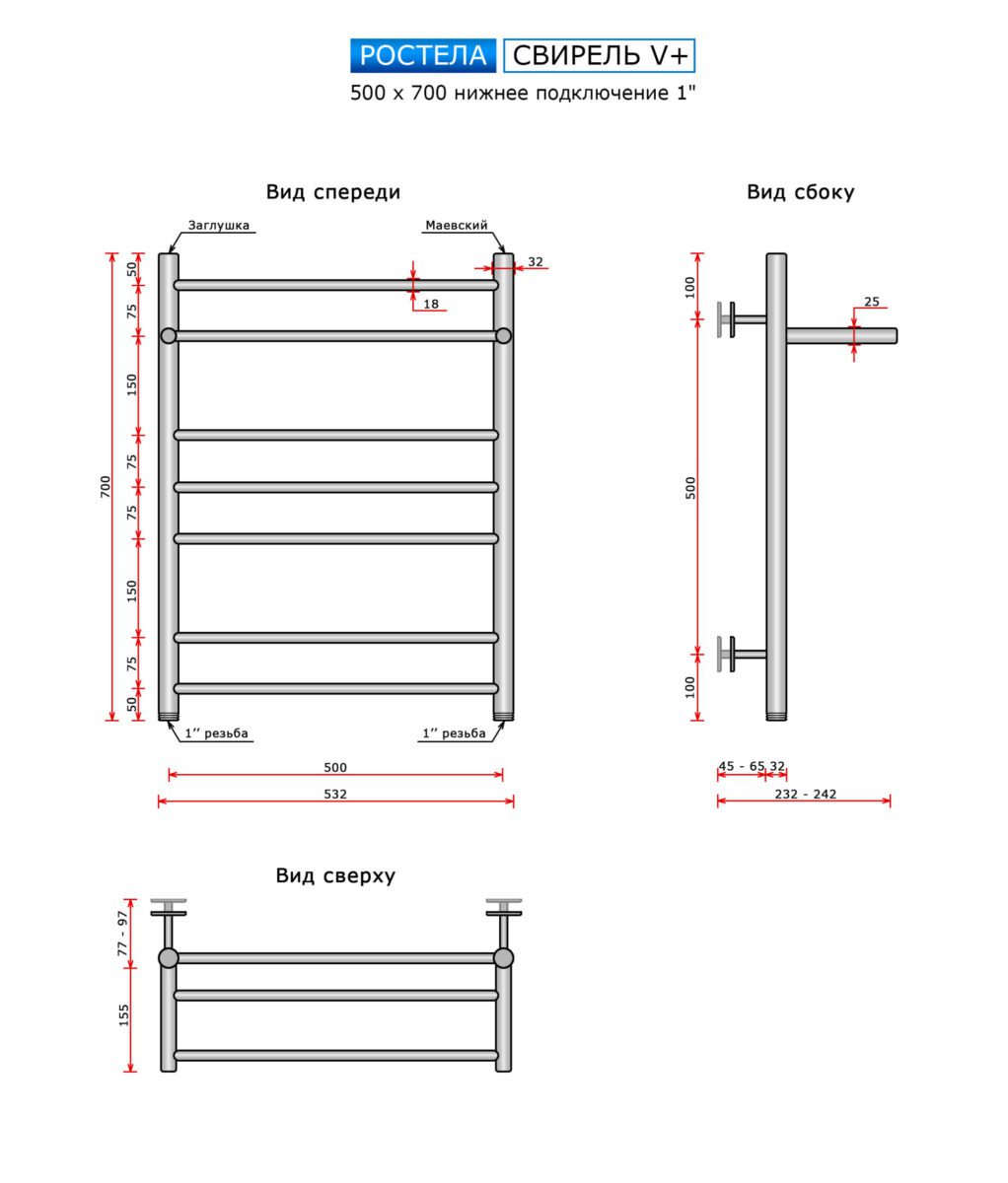 Полотенцесушитель Ростела Свирель V+ (с пол.,нижн.подв.,1" рез) 500*700/8