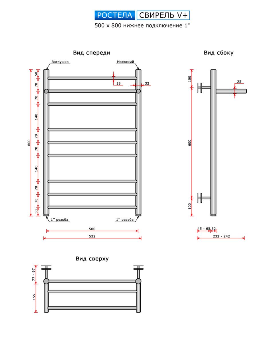 Полотенцесушитель Ростела Свирель V+ (с пол.,нижн.подв.,1" рез) 500*800/10