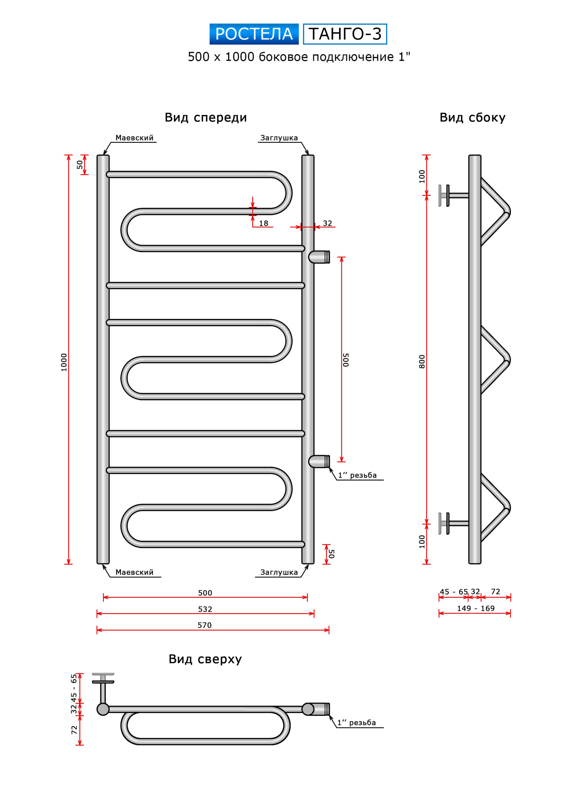 Полотенцесушитель Ростела Танго 3 (бок.подв.,1"рез) 500*1000