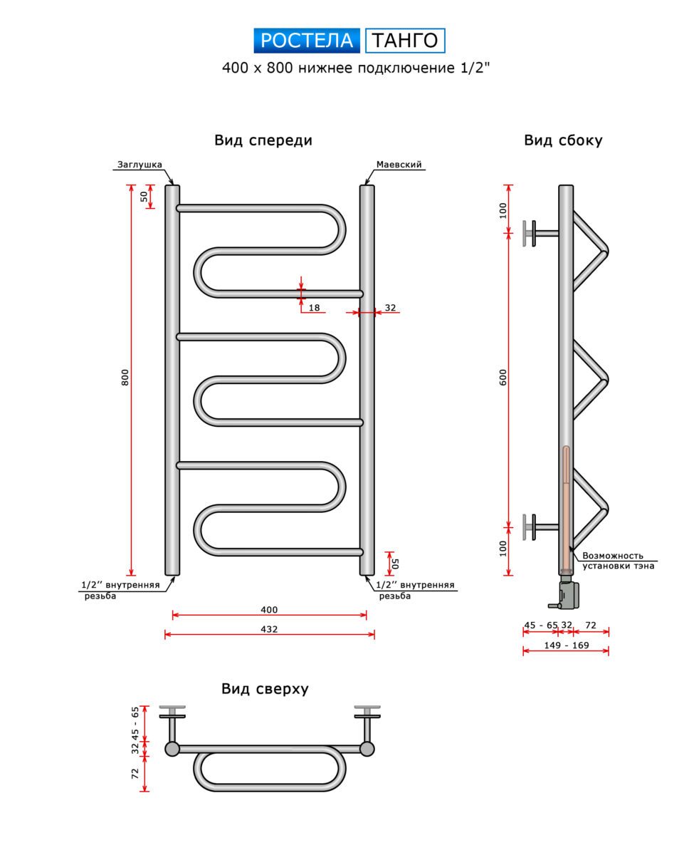 Полотенцесушитель Ростела Танго (нижн.подв.,1/2" рез) 400*800