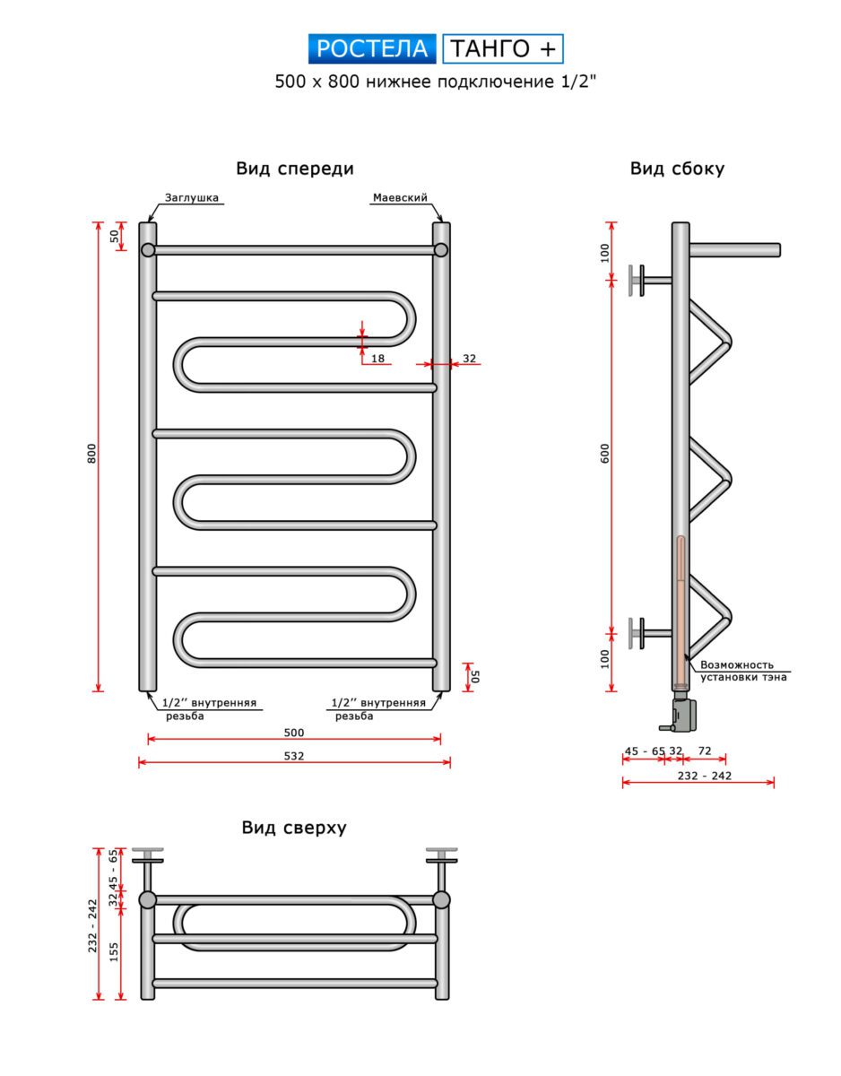 Полотенцесушитель Ростела Танго + (нижн.подв.,1/2" рез) 500*800