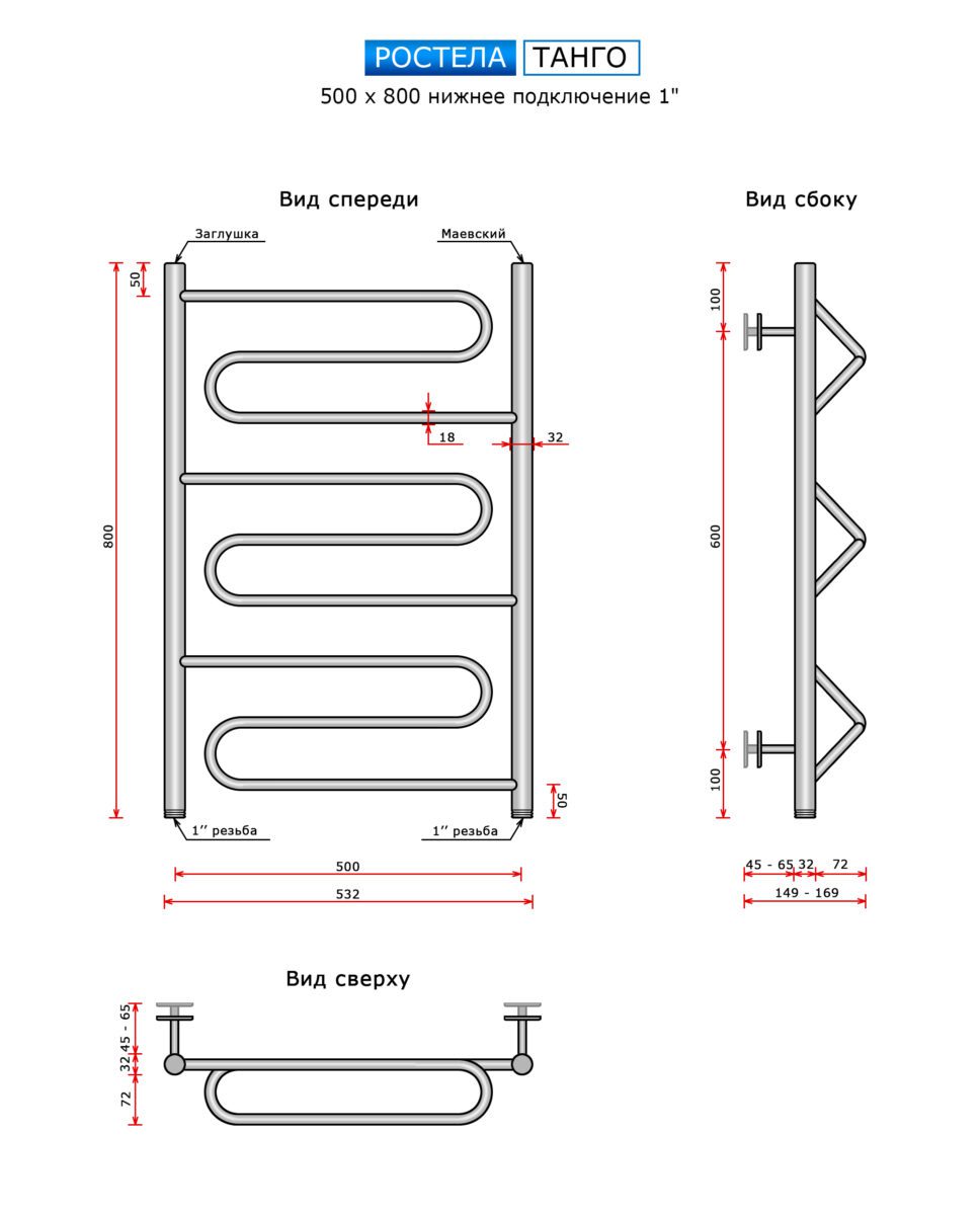 Полотенцесушитель Ростела Танго (нижн.подв.,1" рез) 500*800