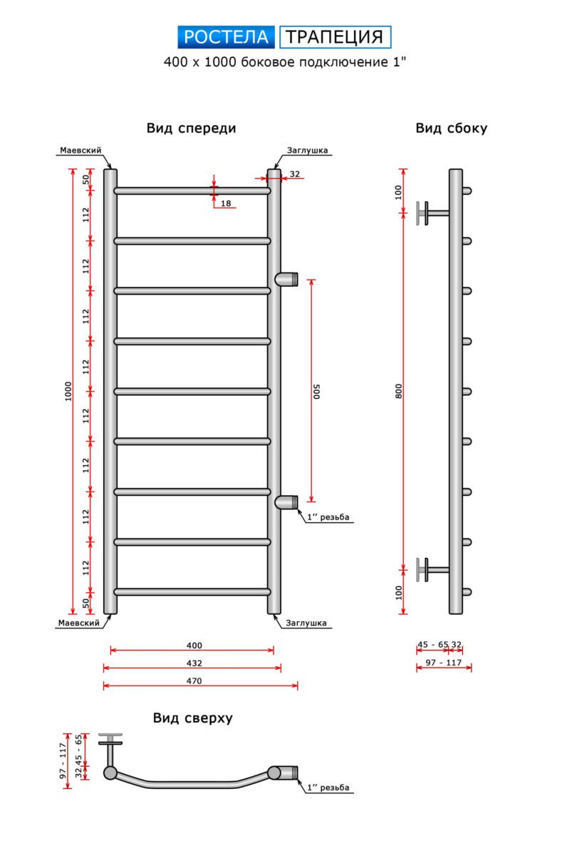 Полотенцесушитель Ростела Трапеция (бок.подв.,1" резьба) 400 х 1000 / 9