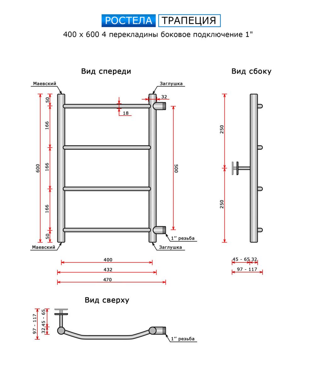 Полотенцесушитель Ростела Трапеция (бок.подв.,1" резьба) 400 х 600 / 4
