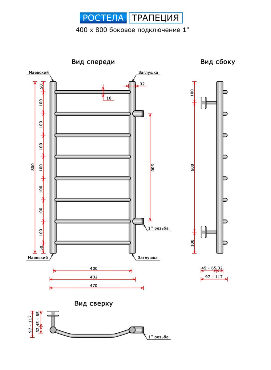 Полотенцесушитель Ростела Трапеция (бок.подв.,1" резьба) 400 х 800 / 8