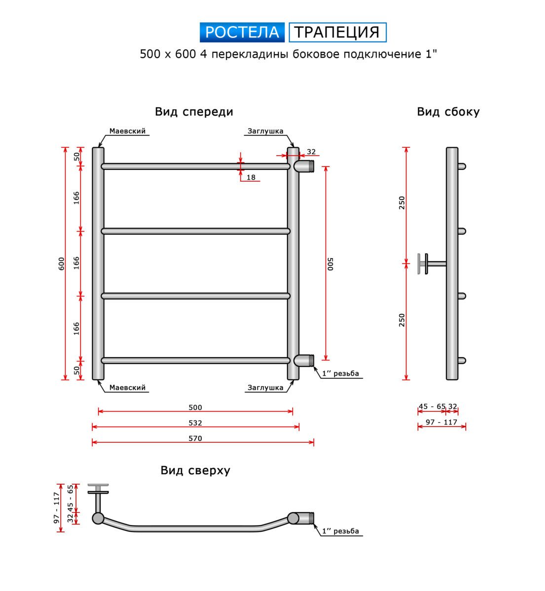 Полотенцесушитель Ростела Трапеция (бок.подв.,1" резьба) 500 х 600 / 4
