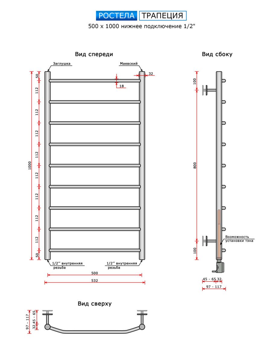 Полотенцесушитель Ростела Трапеция (нижн.подв., 1/2" резьба) 500 х 1000 / 9