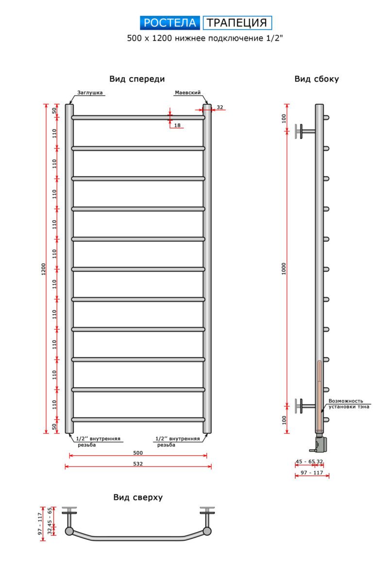 Полотенцесушитель Ростела Трапеция (нижн.подв., 1/2" резьба) 500 х 1200 / 11
