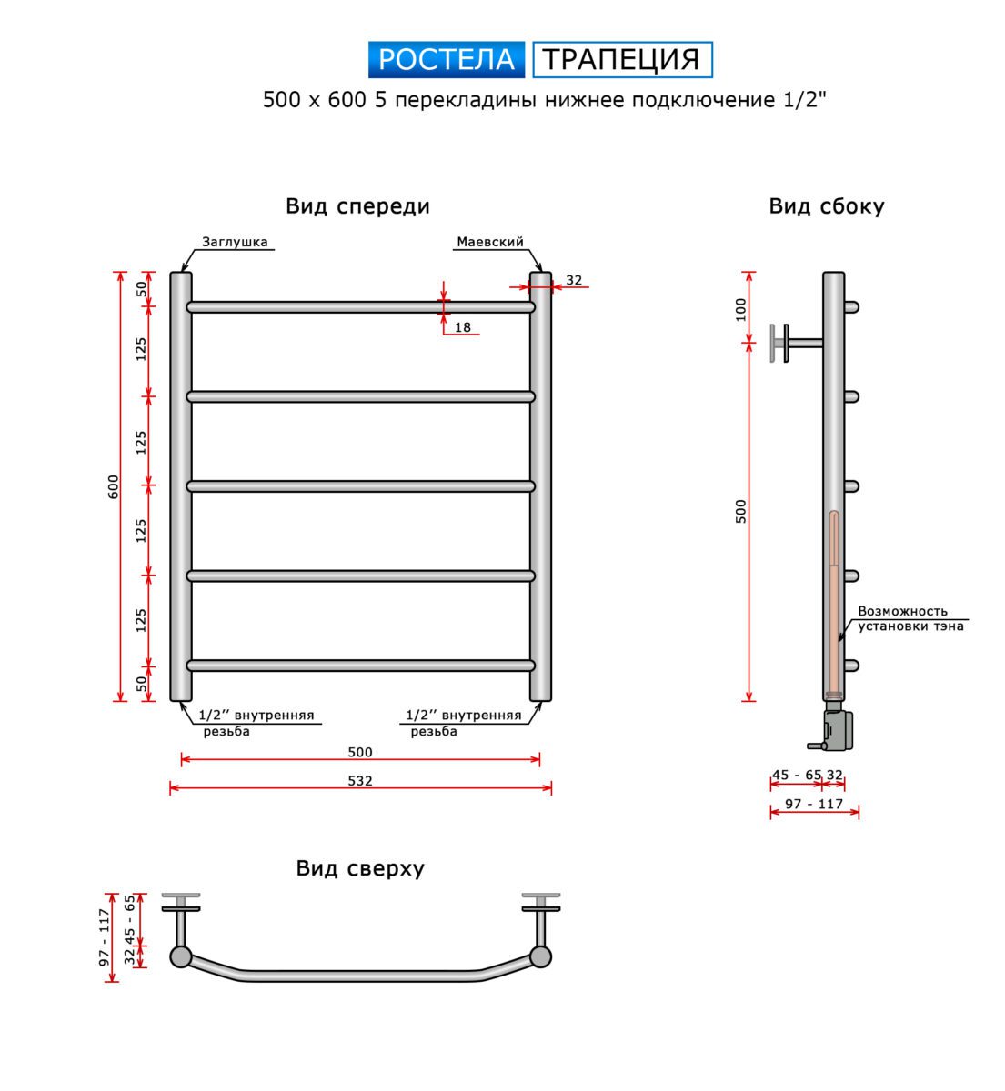 Полотенцесушитель Ростела Трапеция (нижн.подв., 1/2" резьба) 500 х 600 / 5