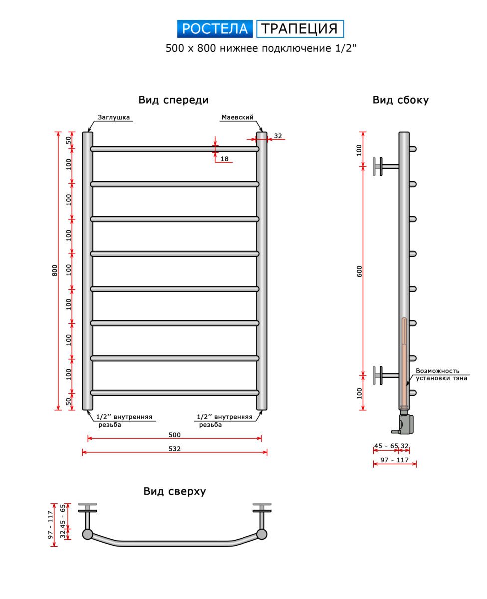 Полотенцесушитель Ростела Трапеция (нижн.подв., 1/2" резьба) 500 х 800 / 8