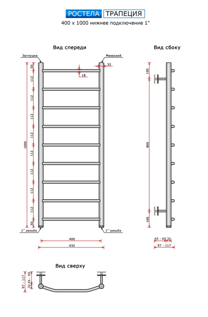 Полотенцесушитель Ростела Трапеция (нижн.подв., 1" резьба) 400 х 1000 / 9