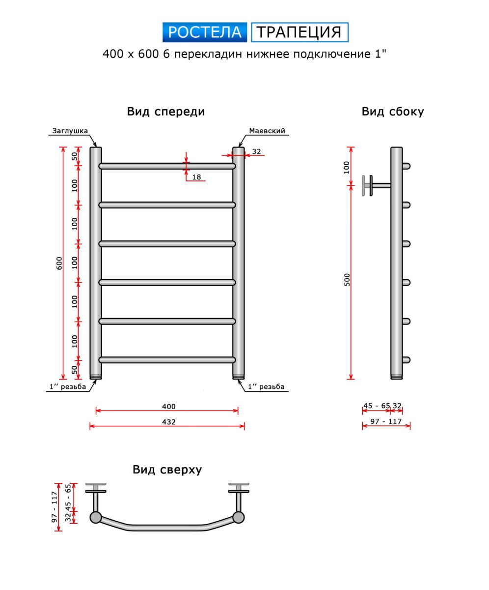 Полотенцесушитель Ростела Трапеция (нижн.подв., 1" резьба) 400 х 600 / 6