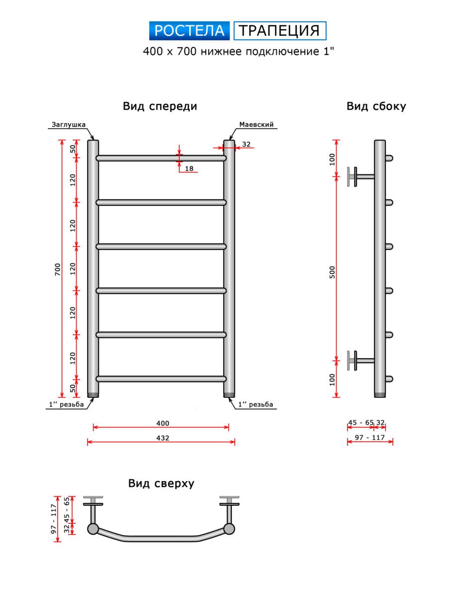 Полотенцесушитель Ростела Трапеция (нижн.подв., 1" резьба) 400 х 700 / 6