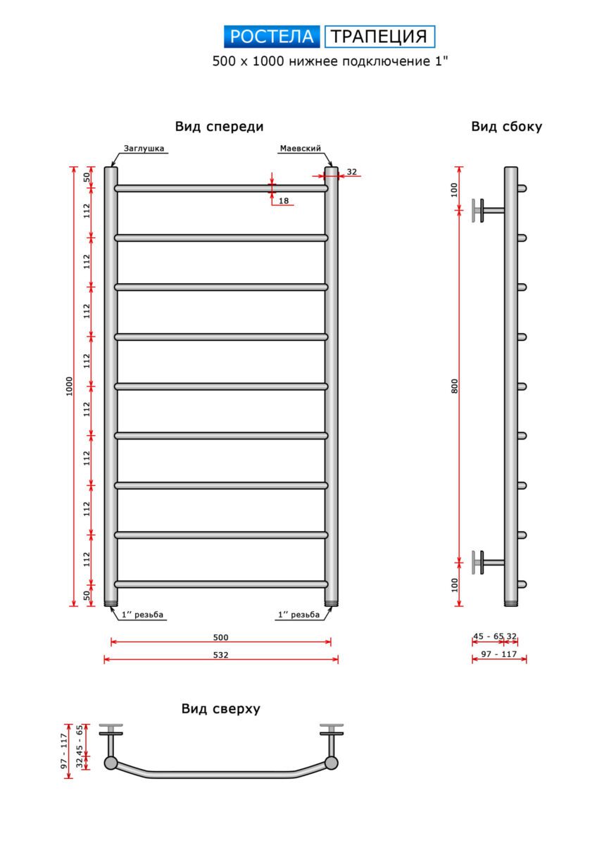 Полотенцесушитель Ростела Трапеция (нижн.подв., 1" резьба) 500 х 1000 / 9