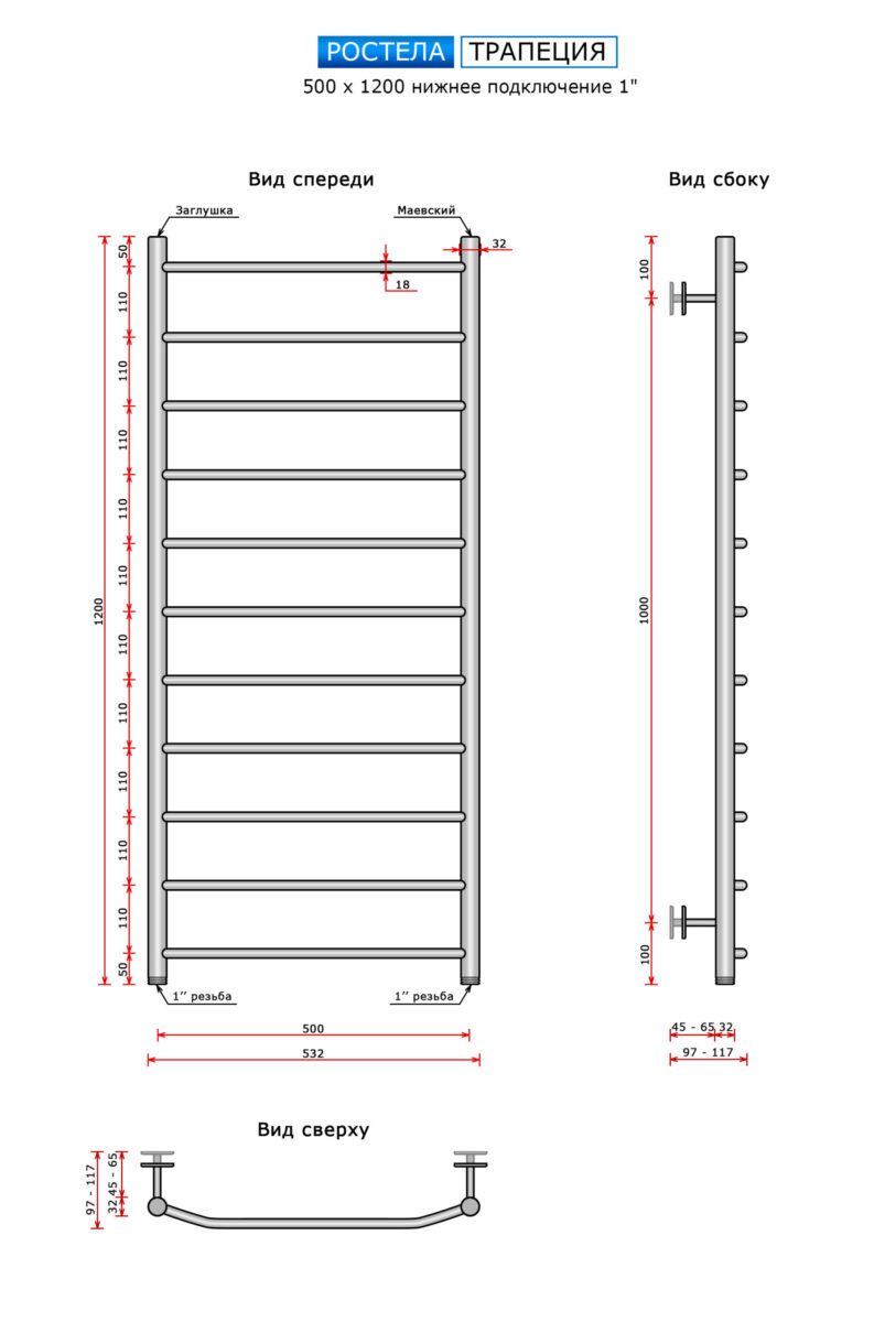 Полотенцесушитель Ростела Трапеция (нижн.подв., 1" резьба) 500 х 1200 / 11