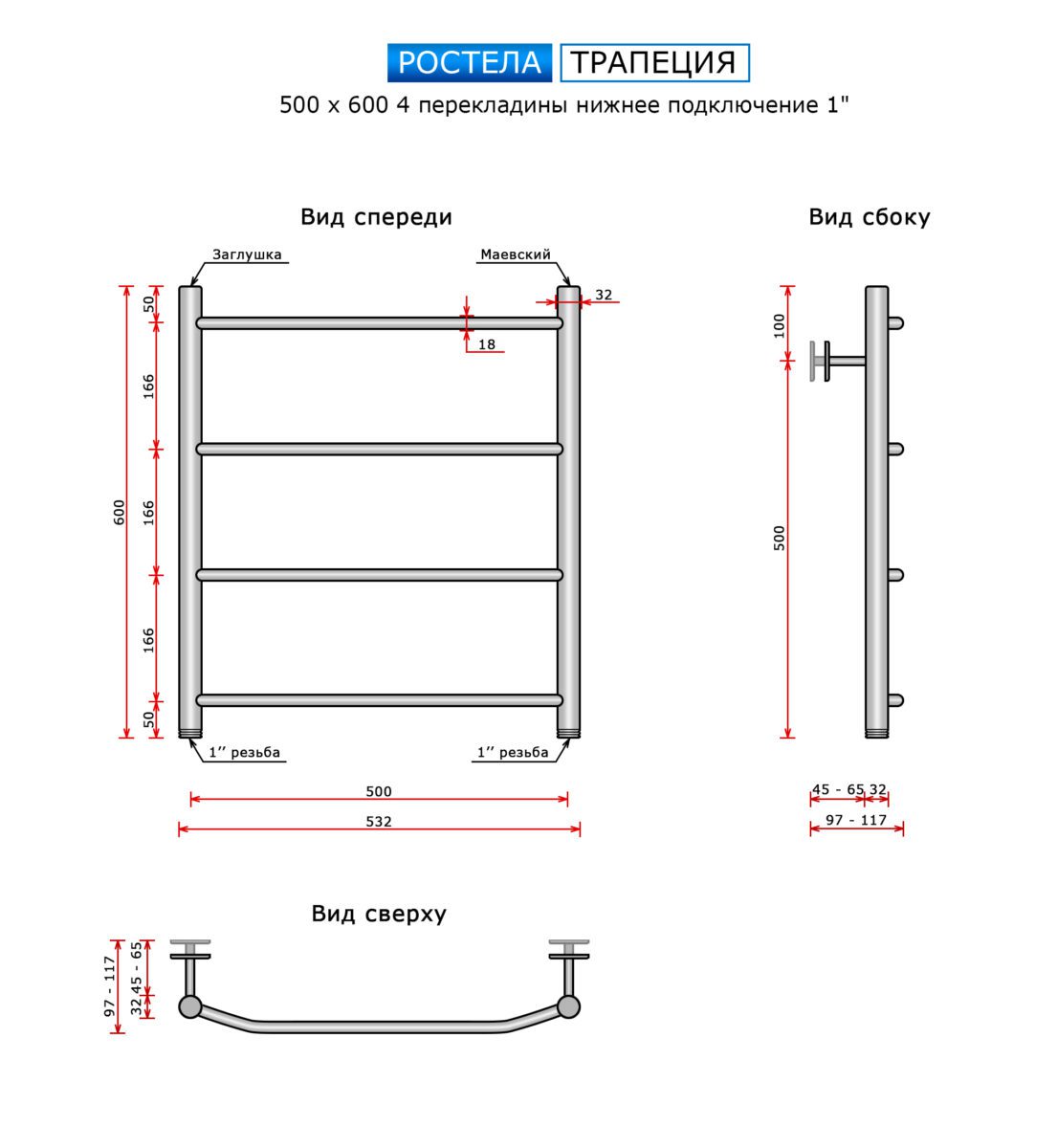 Полотенцесушитель Ростела Трапеция (нижн.подв., 1" резьба) 500 х 600 / 4