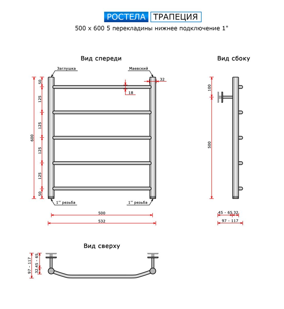 Полотенцесушитель Ростела Трапеция (нижн.подв., 1" резьба) 500 х 600 / 5